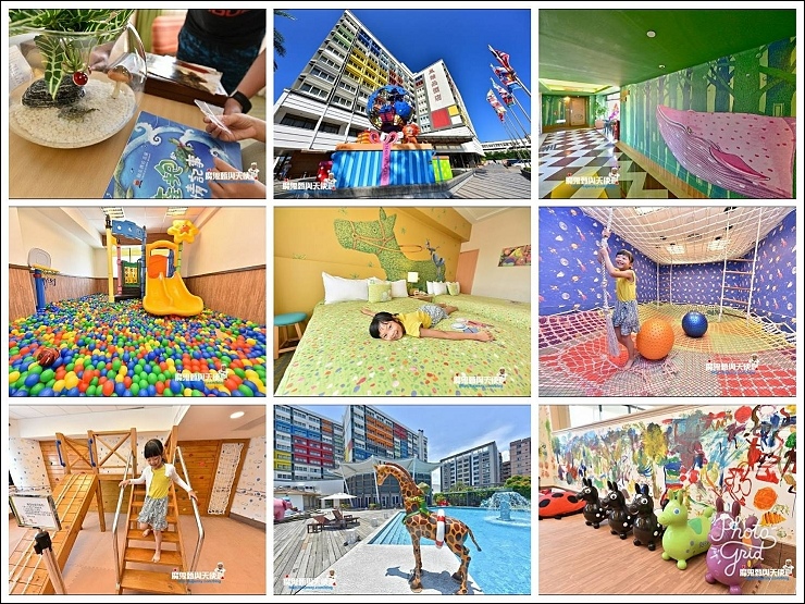 藍天白雲下彩色積木堆疊而成的翰品酒店,再加上門口的大型幾米禮物盒,還沒進門就充滿了童趣!連後方停車場的牆壁也都是幾米彩繪,而且都是有版權的喔!