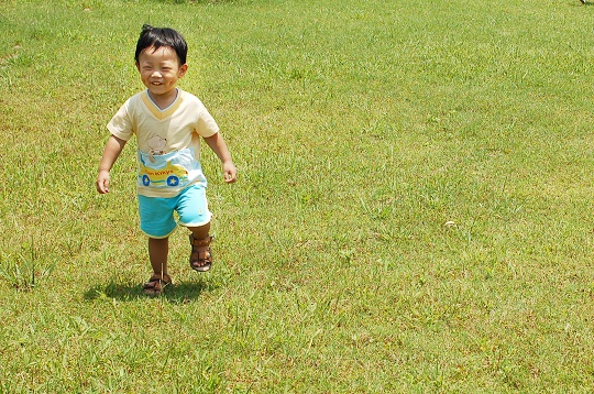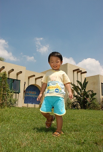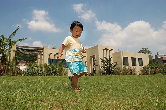 這個草皮不論大小或景觀視野都很不錯,往遠處看不是青翠稻田就是藍天白雲,沒有任何高聳建築阻礙視野,小孩子在這裏跑跑跳跳再安全也不過了,重點是接下來的餐點十分好吃(又要留待下回分解~),連向來不愛吃東西只愛喝奶的允嘉都"大吃了一盤"!