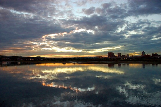 到了這張照片時,四周已是一片昏暗,水面上只剩燈火倒影,這時我們才發現華江橋上及堤外道路上的路燈早已點上。