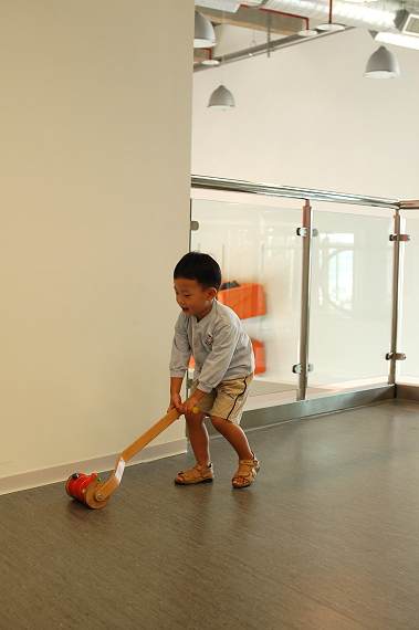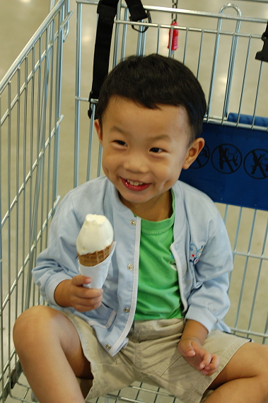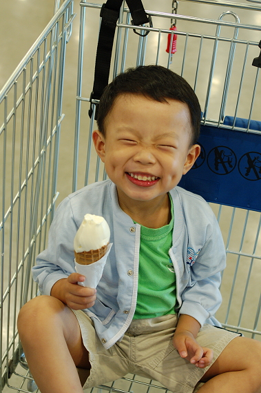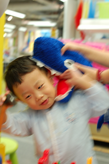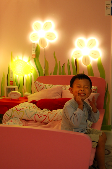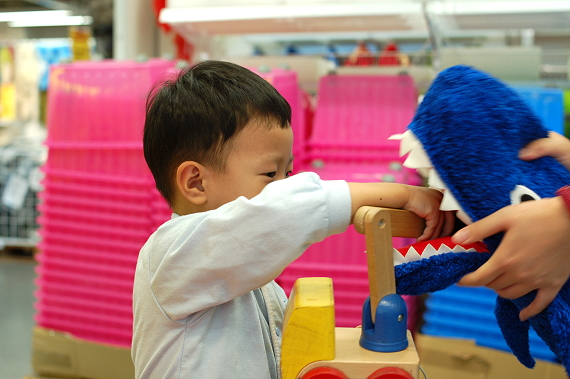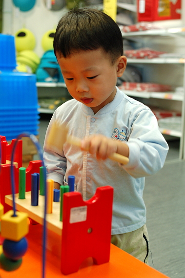 炙熱夏日,連走在戶外都是熱風,如果硬要出門的話還是走室內路線為宜,最後決定去開幕一陣子的新莊IKEA吹免費冷氣(離家裏只要十分鐘路程,超快超爽!),十點才開始營業,我們大約十點半到,還沒什麼人來,不但好停車連廁所都超乾淨,玩具也隨便允嘉玩沒人搶,允嘉玩到不想走,只肯留在兒童玩具區。