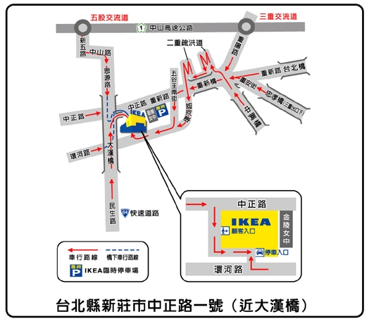 走北二高的話,下中和交流道轉64號(八里-新店)快速道路往板橋新莊方向,過大漢橋右轉中正路即達。