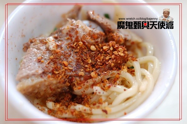 鳥先生暴力吃法之二,將湯麵的麵條撈至小碗,加入辣椒粉乾拌。