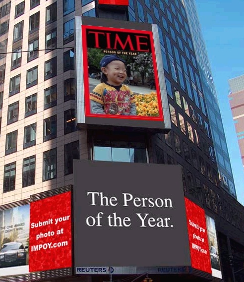 想和美國總統布希、英國女王伊麗莎白二世或紐約前市長朱利安尼一樣榮膺《時代》雜誌「年度風雲人物」嗎?現在機會來了。《時代》為宣傳年度風雲人物評選,今年派出攝影師在紐約時代廣場拍攝路人大頭照,然後製作成封面在廣場上1幅巨型電子看板播送,來不及飛到紐約的民眾,也可透過網路上傳照片,爭取這4秒鐘的風光。