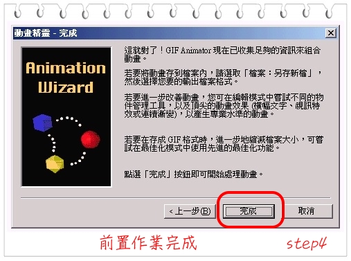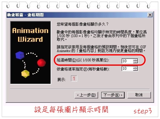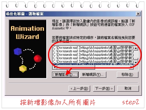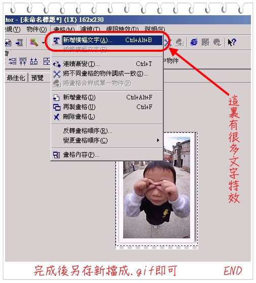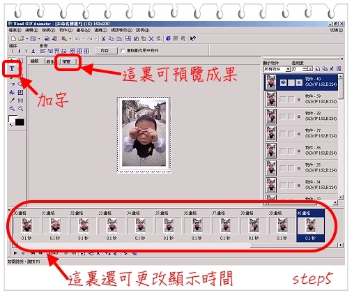 檔案>動畫精靈>加入圖片>設定畫格時間>加字預覽>完成