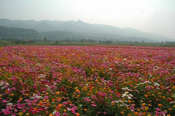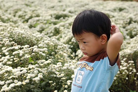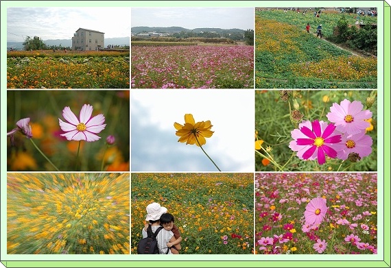 一聽到本週是杭菊盛開期,特地帶著允嘉再度造訪,上山的道路旁田地裏完全看不到杭菊,過了九湖國小,把車停在九湖村農特產中心停車場,往旁邊一看,去年種滿杭菊的田地,已經變成五顏六色的波斯菊,再往上一看,另一區改成種滿了向日葵,再努力點繼續往上走,才開始出現大畝的杭菊田,但是跟去年茂盛榮景比起來實在是遜色許多。略感失望的我們沒有待很久,就離開這片人潮正大量湧進中的杭菊田,想說順著山路的另一端繞繞看,也許別的地方有更多的杭菊,結果只有看到小小一兩片,於是我們不到一個小時就離開九湖村,把大部分時間花在逛逛銅鑼車站老街,享用附近早市裏銅鑼街上高朋滿座的牛肉麵(容後介紹...)。