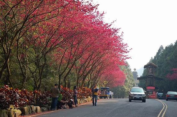 車子一開到九族文化村門口,收票亭前就是整排的粉紅櫻花美景~~