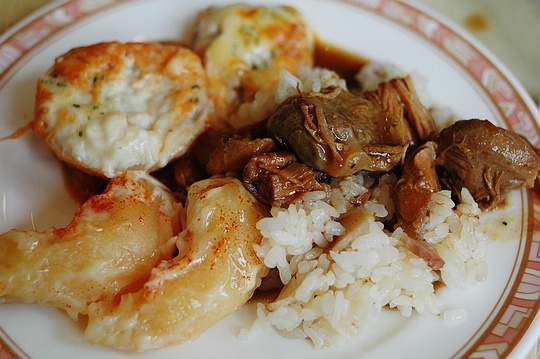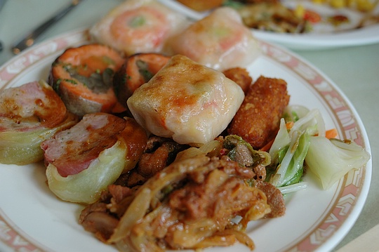 王子飯店的自助午餐,比起前一天十勝綠館的自助晚餐菜色還要好一些,好吃的東西也多一些。上面這盤的炸雞塊、洋蔥圈、炸馬鈴薯球都不錯吃,還有這個盤子是兒童專用的喔!