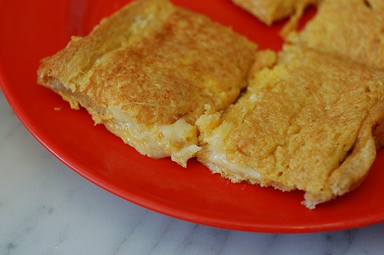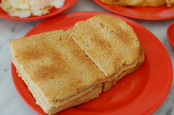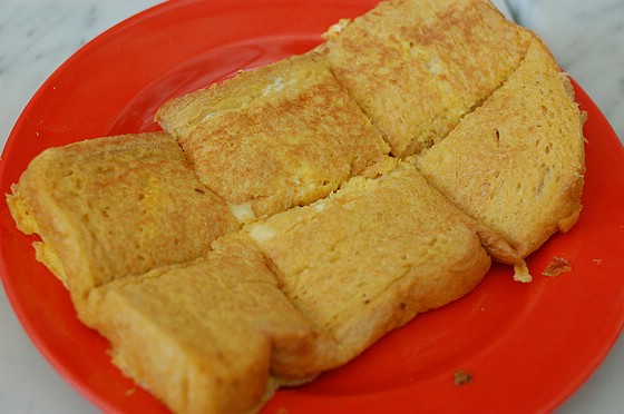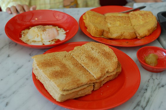 對於養生蛋沒什麼印象,因為一口就將掉了,老板看到我們帶了小孩,還主動問我們蛋要不要改成全熟,服務算是不錯!夾了牛油的土司整塊都是脆脆的,完全沒有土司鬆軟的口感,感覺上比較像是在吃香酥可口的夾心餅乾。法式起士土司沾著咖椰醬吃雖然還不錯,但是比起阿根早餐的法乳培,還是差了一點點...