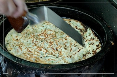 記不得到底有多久沒來這兒光顧了!只見老闆邊轉動正在煎的油餅邊用鐵鏟把餅弄鬆,不厭其煩一次又一次的迅速熟練地將蔥油餅翻弄抓皺攤平,這麼用心及費功夫,自然表現在口感上,難怪吃起來口感很鬆軟,與一般的蔥油餅很不同。