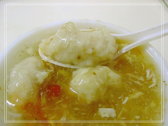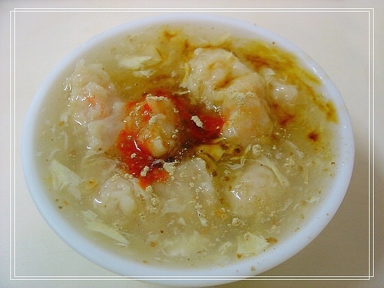 小小一碗蝦仁羹,乍看之下分量似乎不多,但是把一碗喀光至少也有八分飽。推究其原因就在裝蝦仁羹的碗,一般外面有名的花枝羹或蝦仁羹用的碗都是寬口淺淺的碗,王記蝦仁羹的碗深度還蠻夠的,裏面裝了滿滿的大顆蝦仁羹,每顆蝦仁羹的size都跟塑膠湯匙一樣大,舀起來時湯匙還會抖來抖去快要支撐不住的樣子。蝦仁羹的魚漿裏面包了兩顆蝦仁,魚漿和蝦仁混合起來的口感十足,感覺上蝦仁彈性及鮮度都不錯,難怪生意會那麼好,只靠一種蝦仁羹就撐起了一家店,這也讓我聯想到很多賣蚵仔麵線的老板車庫裏停的都是雙B。