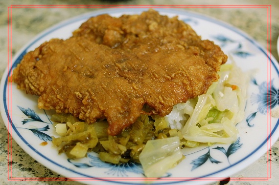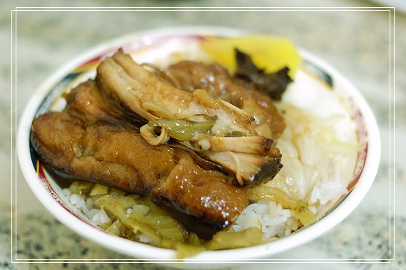 這間老牌黃燉肉飯是Tina口中的"台式速食" ,不論是面門裝潢或料理都是十足的台式古早味,飯類的配菜一律是醃黃蘿蔔、炒高麗菜、酸菜,另附一碗菜頭或味噌湯。