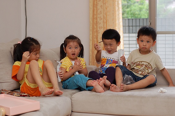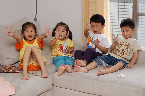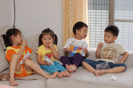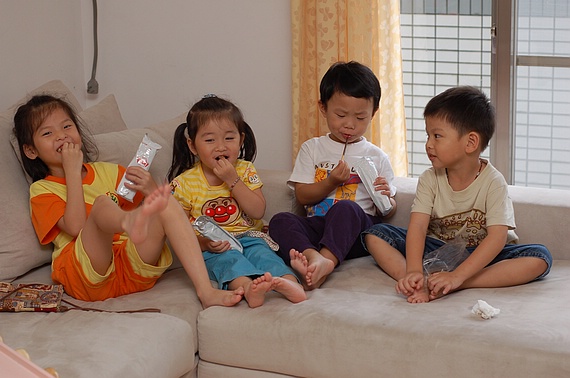 正當大人們放肆開動的同時,小小孩們則乖乖坐在沙發一角,吃起巧克力棒來!