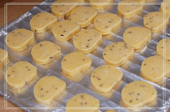 小鳳拿出預先凍在冰箱裏的餅乾棒,將其切割成塊狀放入預熱烤箱烘烤25分鐘即完成。