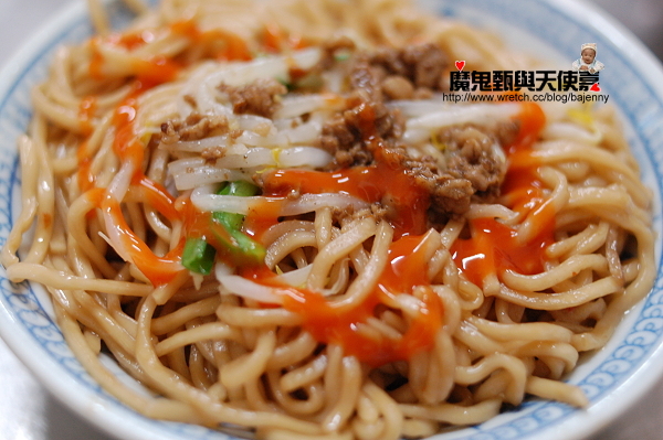 搭配豬血湯的主食為炒麵25元,類似一般傳統市場炒好一大鍋的那種炒米粉炒麵,略油口味重,但和清爽的豬血湯反而成為絕配,一重一輕一油一淡,簡直是天作之合,perfect!