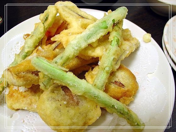 今年五月自己來吃的時候,點了鮪魚肚握壽司、海膽壽司、味增湯、炒麵及蔬菜天婦羅。鮪魚肚油脂豐富,海膽壽司入口即化,兩種雖然都新鮮好吃但是都好小一顆(比十元壽司大一點點點...)。太春的炸豆腐外面有裹上一層太白粉(類似蚵仔麵線的蚵仔)後才下去炸,雖然沒有說很好吃,但是口感很特別。野菜天婦羅裏面有茄子2片、芋頭2片、地瓜2片、四季豆4大根、香菇2朵,算是便宜超值,其中的茄子、四季豆、香菇特別好吃,尤其是大朵肉厚的香菇。至於完全不搭調的炒麵,是最後才加點的,加點的原因是因為看到每桌上都有一盤炒麵(應該很好吃才是),口味跟延三夜市的炒麵專家很像(強烈懷疑店家騎bubu過去打包回來)。