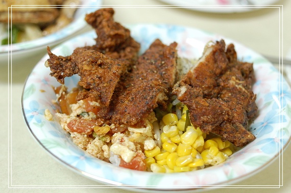 芳園的招牌排骨飯90元,很難想像在這麼不熱鬧的巷弄中,這麼不起眼的小店,店內不要說沒有裝潢,充其量只是擺幾張桌子、椅子應急,甚至連牆上都可見裸露的鋼筋水泥,排骨飯賣到這個價錢,竟有人願意上門。探究其原因,實因排骨的醃漬和炸粉都調配的很出色,可惜還是跟雞腿一樣炸到過頭,肉質口感嚴重喪失,可惜啊~不然肯定比東一排骨好吃許多!