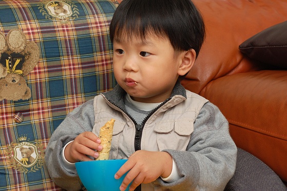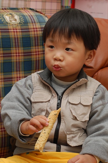 為了避免吃到屑屑掉滿地,允嘉還會用碗接著吃喔~~