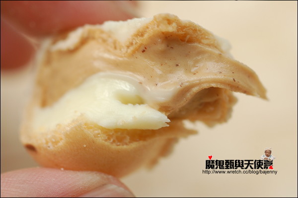 一口吃下半隻,雙層巧克力內餡(有一層疑似花生醬),滑潤綿密甜到化不開,味道竟與金莎巧克力雷同,不禁讓我想到鳥先生N百年前送我的金莎花束^^