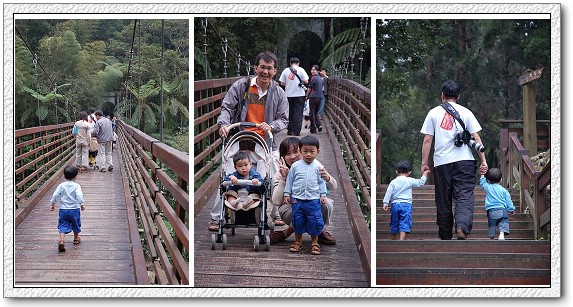 允嘉果然遺傳我的懶人惰性要坐娃娃車,振庭則如同萍子般勤勞愛推車,所以說孩子是誰生的真的都假不了。兩個文靜派的兄弟一個坐一個推,振庭一路上輕手對允嘉摸來摸去,允嘉也予以回應,聽說這是振庭表現愛意及友善的方式。而愛說話的允嘉更是一直嚷著詢問大家,有沒有看到獅子?有沒有看到梅花鹿?有沒有看到犀牛?我說大爺我們是來森林遊樂園,不是來動物園啊~活潑好動的恩恩不但一馬向前衝且不受拘束,如果阻撓他就哭給你看,所以燕子疲於奔命,真的要幫她抱小孩,恩恩又不肯,非要親娘不可!就算是jason也拐騙不了他,真是傷腦筋(所以這裡都沒有恩恩的照片,不見人影去了@@)~至於年紀最小的安安則是乖乖坐在娃娃車上,任由爸媽帶他遊山玩水。