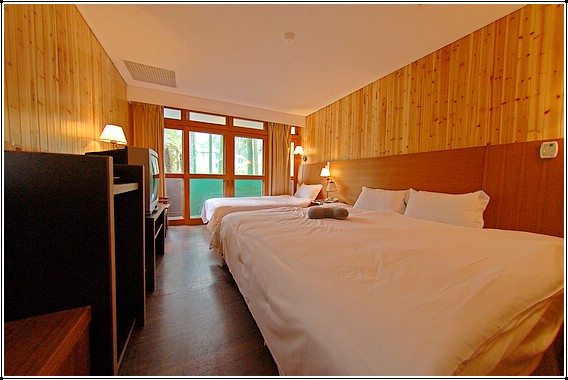 由於第一天長途跋涉,體念眾家男人開車的辛苦,第一天的行程完全是定點活動,如期結束忘憂森林的行程,車隊緩步駛向溪頭森林遊樂區,於裏面住宿者不須另付門票但需停車費100元,辦理好入住手序,今晚四組人馬被安排入住漢光樓,小玉原以為我們入住小木屋,結果我們是住在水泥大樓啦!只是內部裝潢多是用木頭建蓋,而最令人讚嘆的是床超大,完全符合我跟鳥先生噸位需求,其實這就是三人房,因為提供三人份衛生用品,看來今天晚上可以好好睡上一覺!