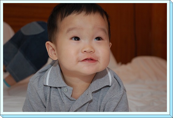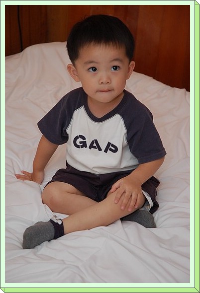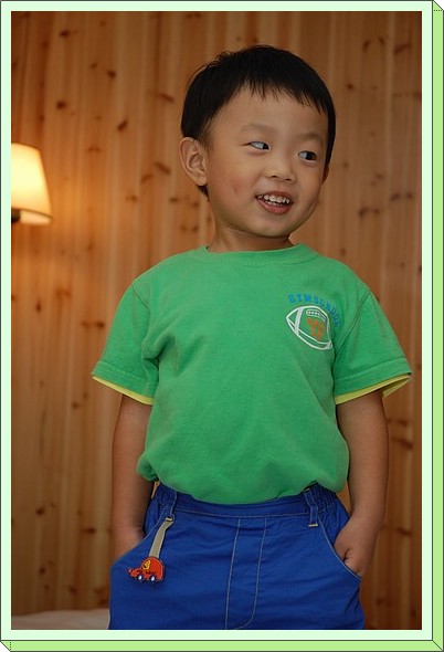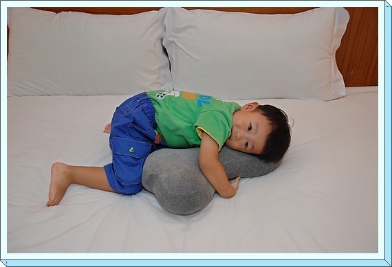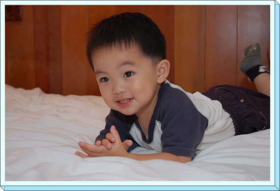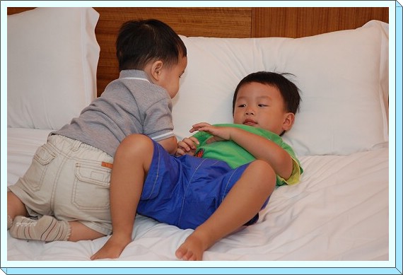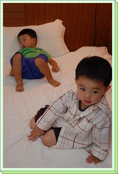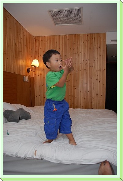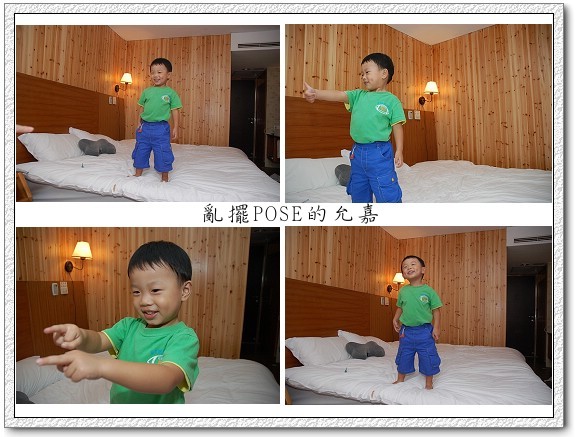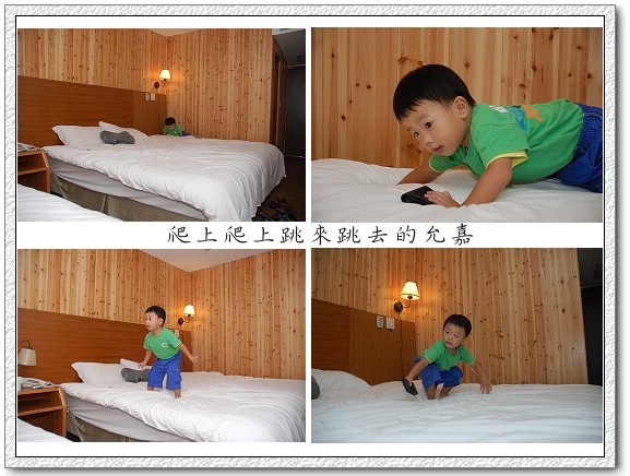 用餐結束返回住宿的地點,每家忙著料理各自小孩的同時,允嘉則與我在房間大玩"你丟我撿"的遊戲,由於剛才他都沒有下車運動,為了讓他消磨體力好及早就寢,於是充份發揮大床的效用,為娘的我使勁一拋就可讓他從這頭跑到那頭,甚至充當杆弟:上下床撿撿撿。看他忙著上上下下跑得臉紅脖子粗的,看來今天早早就寢應該是沒問題的!果然,十點準時夢周公,這晚我跟允嘉睡得香甜,鳥先生更與jason相約清晨五點半起床勘景,真是佩服他們的體力及毅力。隔天才知道安安半夜起來歡一小時,恩恩咳個不停,振庭也有起來小玩一下下,就屬允嘉睡得最安穩,真是謝天謝地。