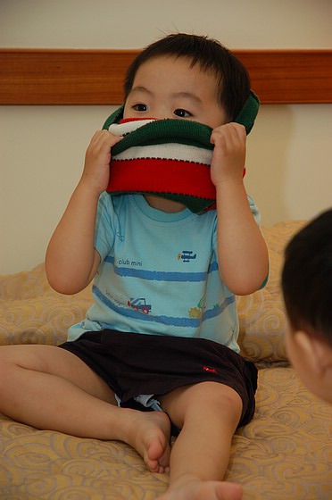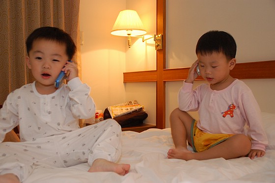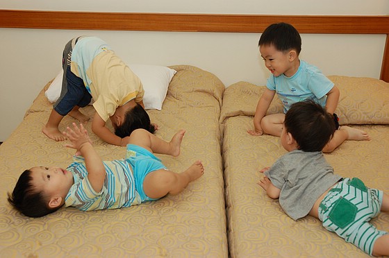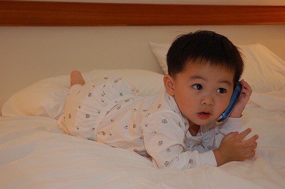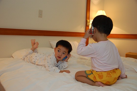 用餐完畢,大伙在商店街上的7-11買了麵包及飲料返回新起點中心,各自回房該梳洗的進浴室,該休息的躺平,之後我則帶著允嘉串門子去,當然找他的好朋友振庭哥哥嘍~兩個人在床上玩起手機,互相模仿其動作,兩個人都是屬斯文派小生,動作慢條斯理的,不會有逞兇鬥狠或是你推我打的情形出現,最多就是一個不順心,眼一閉淚一流的情景發生...雖然睡覺時間已到,但是兩個小孩還是不甘就寢而硬撐,允嘉後來就開始有點歡小哭了一下,於是我帶他回房喝完牛奶就轉身補眠去了!