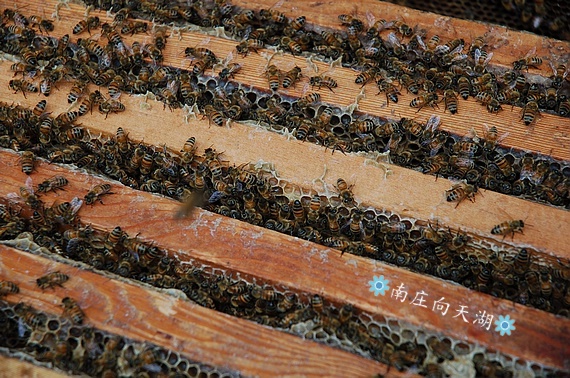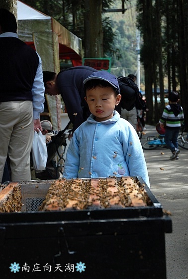 賣蜂蜜的攤商現場展示,允嘉專心的看著密密麻麻的蜜蜂,一付不怕死的樣子~~