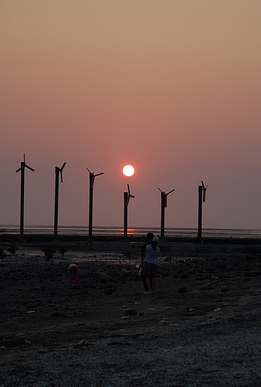 王功漁港特殊風車造景,剛好就在夕陽落下處。