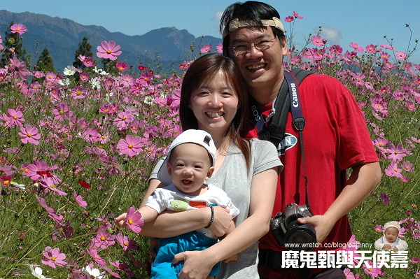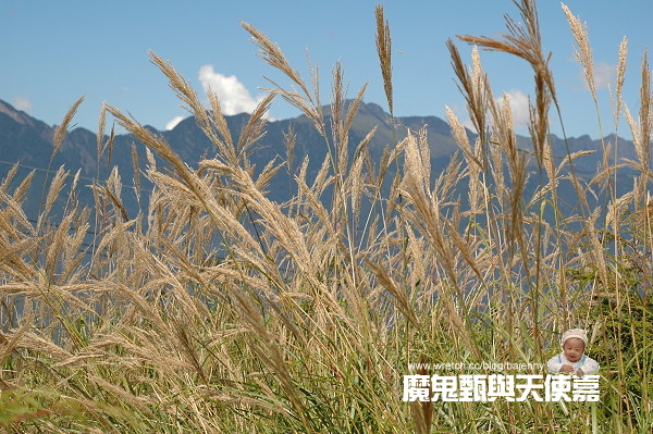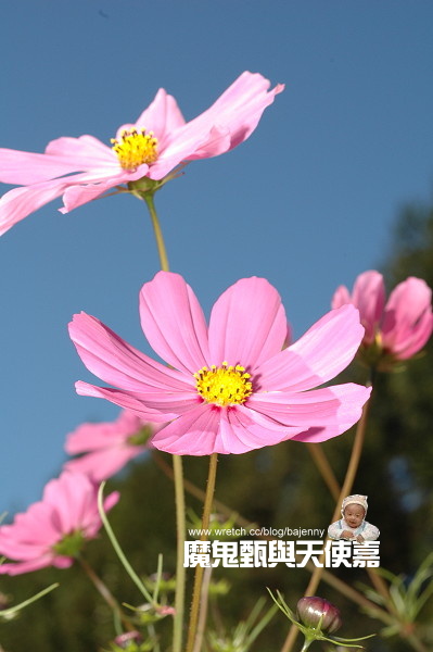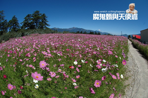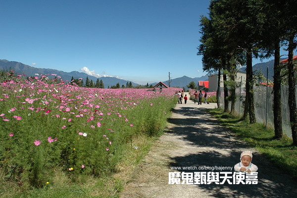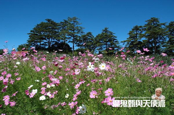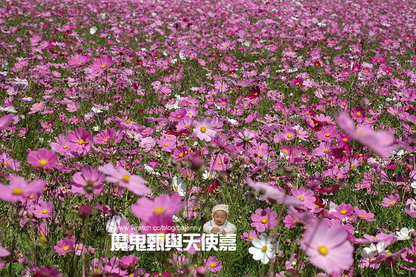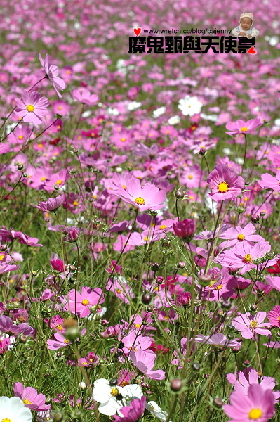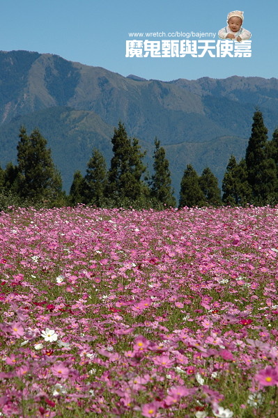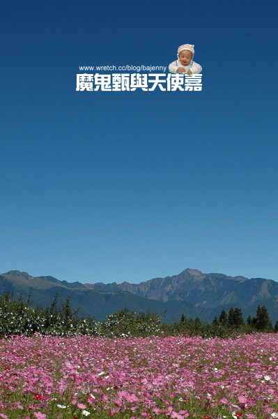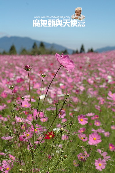 在武陵富野渡假村Check in時,飯店的服務人員告訴我們,現在波斯菊正逢盛開。太好了!原本以為現在來,恐怕什麼都看不到,沒想到還可以賞花!一掃剛才迷路的怨氣,放好行李,趕快趁著有陽光的午後,來個花語寄情吧!一路上兩旁都是隨風搖曳的波斯菊,桃紅、粉、白三色夾雜,美不盛收,將車靠邊停放,我們忘情的拍照,躲在花後、站在花前、聞一聞花香,來張大頭狗吧!極盡擺Pose之能事,真是三八到極點^^,這陣子已經習慣抱著允嘉拍照,由於抱著他無法恣意擺弄身體,純粹只能表情上作變換,今天沒有允嘉,任意這裡照照那裡拍拍,連動態彈跳都難不倒我。不過很可惜的,礙於身材限制,還是只能躲在花後或是燕子身後取景,以擋住我偌大的身軀。這才發現,原來允嘉長久以來都是我最佳的遮蔽物,而且照片中有他,每一張頓時變成亮眼、最值得珍藏的照片,只有我的照片完全沒有可看度orz...