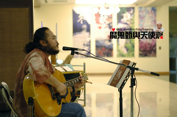 今天演出者是客家歌手謝威宇,一開始不是抱著很大的期待,「應該只是個沒名氣的傢伙吧!」心裡暗想著,沒想到當他發出聲音後,實在是令我著實久久不能自己,他的歌聲讓我從腳底開始發麻到頭頂,最後起雞皮疙瘩。也許是因為現場演唱那種臨場感,特別有震撼力!也或許是他的歌聲真得很好,從丹田所發出的聲音非常飽和鏗鏘有力,再配上優揚的琴聲,令我如癡如醉~禁不得在結束後大聲呼喊:『安可、安可!』害大家都在看我...