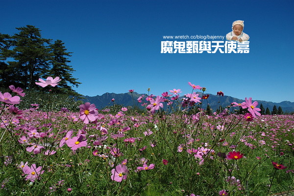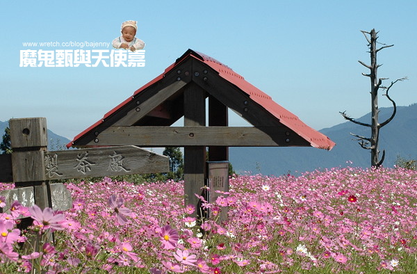 到了福壽山製茶廠,車子就停在製茶廠旁,走過去,一整片花海映入眼廉,「好美喔!」我脫口說出…沒有看過這麼大片波斯菊的我,面對眼前的繽紛花海,此時此刻真希望自己化身為蝴蝶,就這樣飛舞淹沒在群花中…採採蜜、玩玩追迷藏,乘著微風並有青山、雲海與我為伴…