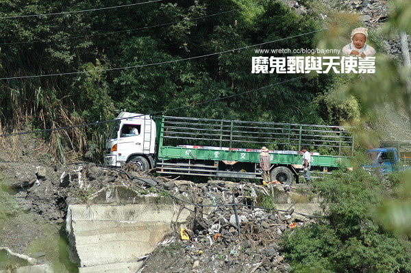 突然前方出現塞車潮,大家都停了下來,發生了什麼事嗎?仔細一看,原來是前方車道路面的柏油路完全流失,只剩下碎石及爛泥,經過的車輛如果輪胎無法抓到路面就會變成空轉而爬不上去,尤以大型車輛如菜車最為嚴重。因為他們的輪胎很大,無法小面積抓到路面,每每想要衝上去,卻又倒退回去而造成險象環生。而有一段車道只能通過一線,也就是說,對面的車如果無法順利通行時,我們這面就會被卡住而動彈不得,只能眼見對岸的車拼命想衝上去,卻又徒勞無功!突然這時出現救星!一台藍色的發財車從我們這邊急駛過去,只見他拿出一條繩子,綁住後面車子車體的下方,然後雙方同時加足馬力,終。於。爬。坡。成。功。但是我們已經在這裡耽誤了一小時之久orz...