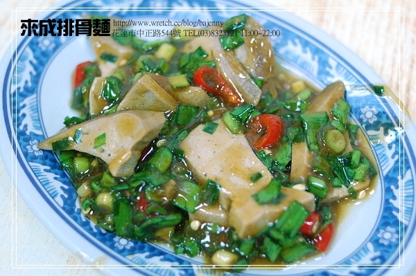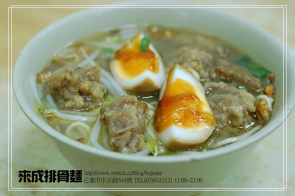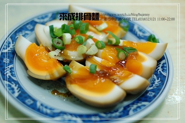 考量到燕子愛吃排骨麵,於是七十年老店的來成排骨麵自然成為來到花蓮的首輪小吃,吃過之後真是差廟東清水排骨麵一大截,湯頭淡而無味,湯頭不好排骨就更不用說了,排骨可是湯頭的靈魂啊!事先大伙在車上還開玩笑的說好吃的話,要開一間在清水排骨麵旁搶生意,最後我連麵跟湯都沒吃完,這念頭馬上破局流標。倒是小菜黃金蛋,獲得Jason和鳥先生不錯的評價。