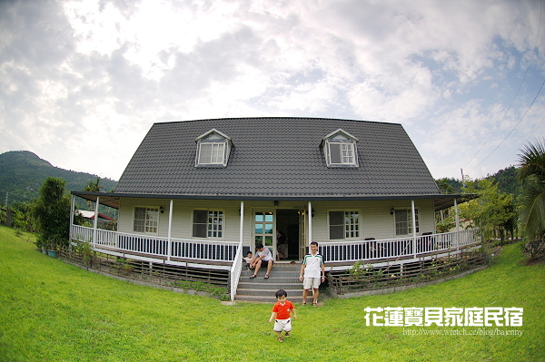 寶貝家庭民宿的庭院草皮有五百坪,左後方有紅龍果棚架可現摘現吃,右後方有護城河及魚池可供小孩餵魚,再過去的左後方就是一片寂靜的夜總會,可惜無緣與小豬媽媽見上一面,不然說不定會有更多的故事在寶貝家庭發生。