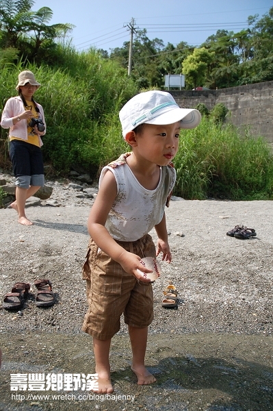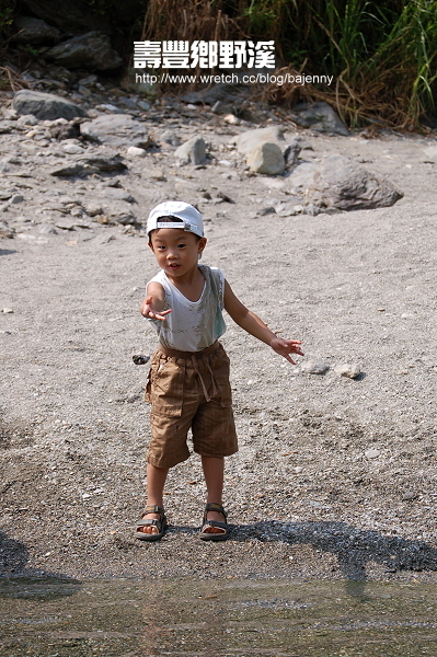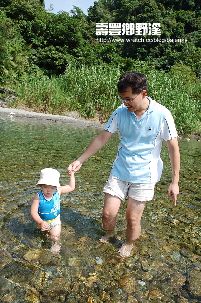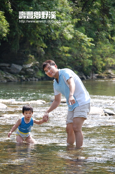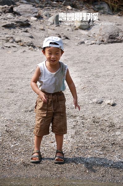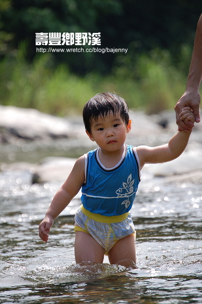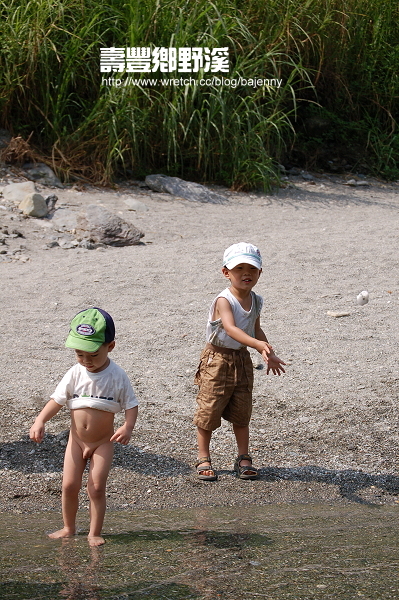 從民宿差不多開5~10分鐘就到了,溪中已有三五年輕人在游泳,溪水真的很乾淨沒有雜質,還有為數不少的魚兒悠游其中,原本大人們想在橋下陰涼處歇腳,但考量到沒有陽光照射怕小孩下水會冷,只好犧牲自我硬是往炙熱的豔陽下去走去。安安索性就穿了內褲下水,恩恩則是下半身被剝個精光露鳥下去,我們允嘉當然是穿載整齊站在岸邊觀鳥啦!雖然後來成功誘使他脫了涼鞋小浸在水中丟石頭,但是我可以很確定的是,我不必幻想要帶他去海島國家,除非有一天他突然轉性變得很愛玩水並且敢下水,不然應該可以直接省下這筆錢。