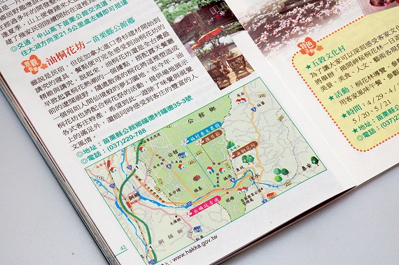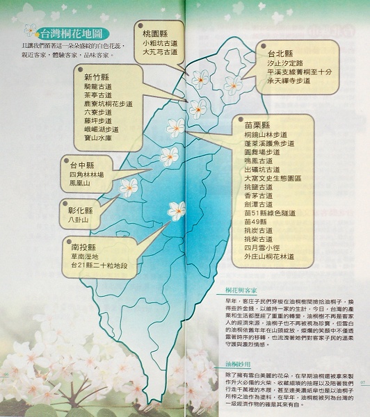 放了兩天,今天公司的事忙完才有時間翻開看看,發現除了夾雜其中的成堆廣告之外,實用的資訊還真不少。在這張台灣桐花地圖旁邊,還有「桐花與客家」、「油桐妙用」的文字說明。