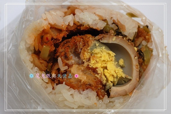 我的最愛「辣味飯團加魯蛋」,米飯軟硬適中,裏面的油條又大且酥口感極佳,其他的配料還有辣味菜脯、酸菜、肉鬆、魯蛋,口味上跟我在林口常吃的阿昌飯團差不多,不過阿昌沒有魯蛋,只有煎得不怎麼好吃的蔥蛋。