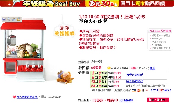 今天中午吃完飯,看到pchome的敗家報限時搶購特價699,點進去看果然是『售完補貨中』,我只能說網路效應真是不可輕乎,廠商這下賺翻了~~~