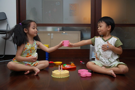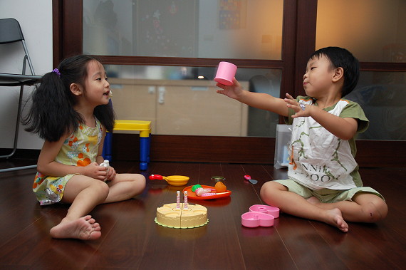這天剛好是允嘉生日前一天,兩個人還玩起生日宴辦家家酒,允嘉非常捧場的大讚蛋糕及橘子汽水好吃!