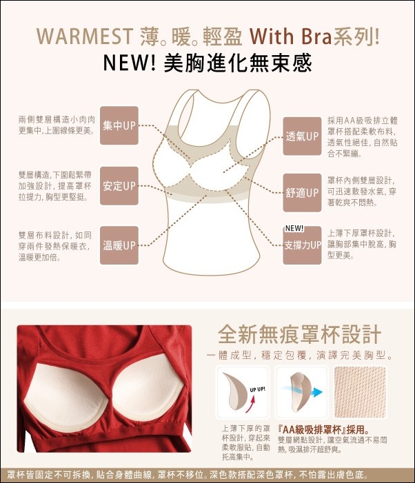 新進化的Bra採用AA級吸排罩杯,上薄下厚設計,加強支撐力集中托高。這款全新升級的With BRA天絲棉發熱衣是今年7net的主打,還特別推出了2件799的特價活動!