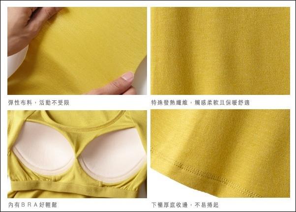 新升級BRA天絲棉發熱衣,33%天絲棉,100%台灣製,顏色豐富選擇多!不愛束縛感的人最適合With Bra的發熱衣,固定不可拆的罩杯很貼身,也不會有移位的問題跟激凸的冏境。