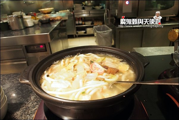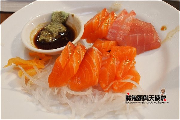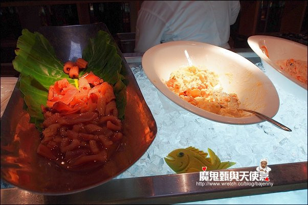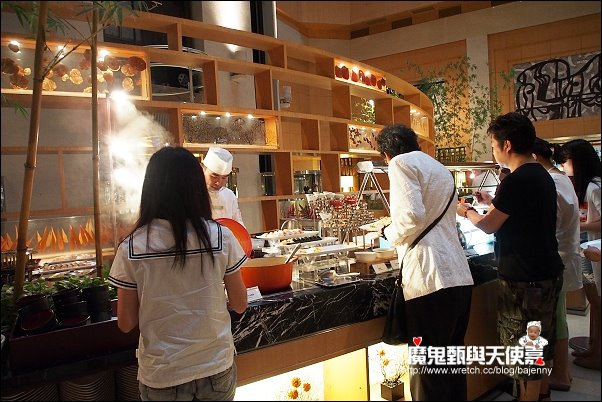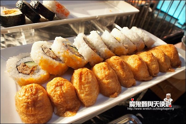 才拿完一盤熟食,想再拿盤生魚片就已經大排長龍了,嘖嘖,平日的下午大家都沒事來喝下午茶哦!只好默默的吃完一盤熟食與水果,等人少一點再來拿生魚片。生魚片大家真的是狂夾猛拿的,還好料理台上的師父早就備料在等,客人夾的差不多,師父馬上補,完全不怕客人吃。生魚片品質還ok,但部位還是跟花大錢去日本料理店吃有差,一分錢一分貨嘛。吃粗飽的壽司丶豆皮壽司我就沒拿啦,味噌湯拿了一碗口味普通。