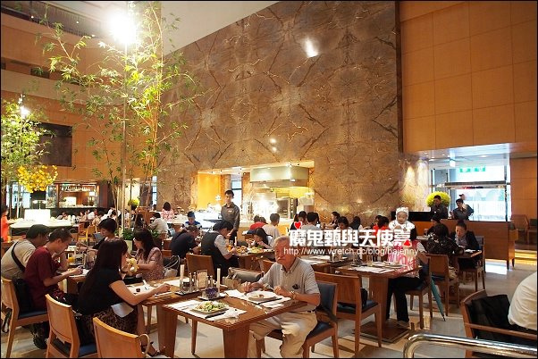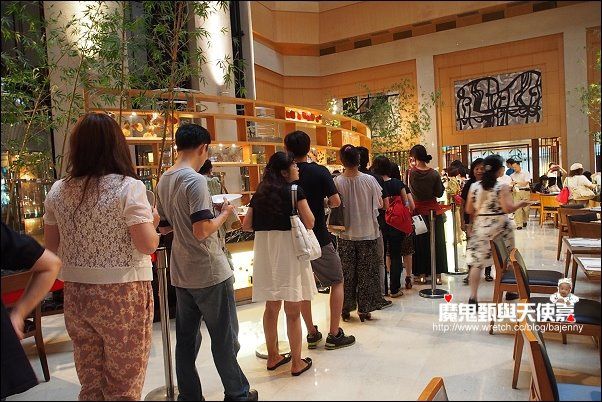喜來登下午茶三點至五點,建議提前來排隊領號,排隊有二區,櫃台這邊一區(是靠生菜丶水果較近),上圖則是第二排隊區靠熟食丶生魚片較近,提早到櫃台領號,會先確認預約人,並告知座位是靠哪區,就排隊等帶位囉!是說我們都先預位了為啥還要提早來排隊呢?這種高級飯店的下午茶買一送一的好康不少人知道,很多人訂的,快三點時就會開始帶位,早點進去可早點拿餐,不然拿餐也要排隊呀!!