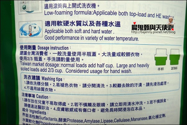 適用台灣軟硬水質及各種水溫,因為是低泡沫配方,所以不挑洗衣機,上開和滾筒洗衣機都合用,5種酵素配方去漬力強,可分解油脂、蛋白質、澱粉及飲料類等常見汙漬。 一般洗衣時我們家都使用1/4~1/2瓶蓋,用量很省,除了衣服較髒較臭或是沾到東西時才會加強用量,或是事先浸泡搓揉。