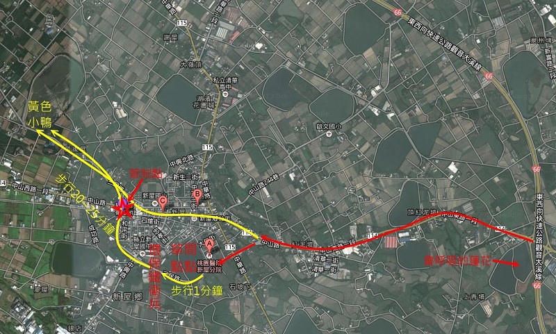 桃園黃色小鴨地景相關路線圖,帶小朋友來又想要一網打盡,還是搭接駁車比較好,但要有人擠人的心理準備。