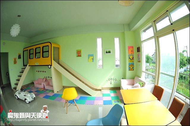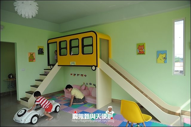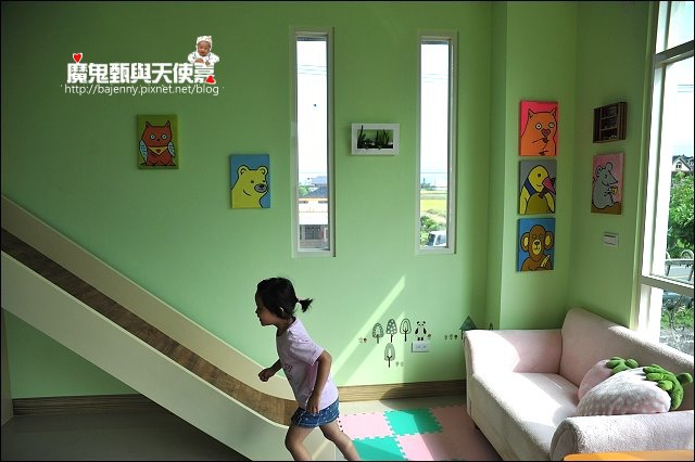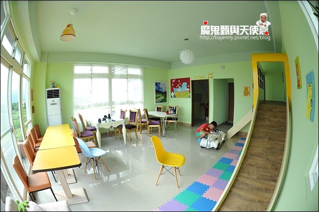 因為聽說這裡有室內溜滑梯,所以在一樓餐廳櫃台check in後,允嘉和野馬妹就直衝二樓民宿區,完全不想進房間,也忘了住宿有送下午茶這件事,總之小朋友只要有溜滑梯或盪鞦韆就夠了...