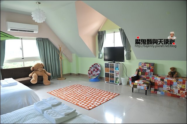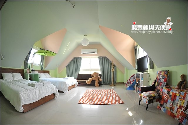 相對梅花湖的三家民宿,這家彩虹屋民宿更廉宜,兩家人來包棟,等於多送你一間客廳,還附小孩最愛的溜滑梯遊戲區,很加分!只是房間內外都有不少大小玩偶點綴與佈置,遊戲區也有小朋友可以坐的沙發位與小抱枕,小孩子看到難免又摟又抱,激烈一點可能會丟擲,如何維持日後的乾淨與整潔性,考驗著民宿管理人員的細心程度與執行力...現在的負責人阿志也有屬於自己的夢想,他希望日後可以帶房客去附近田裡體驗,辦控窯之類的活動,增加主人與房客之間的互動,為民宿帶來溫度和人情味。