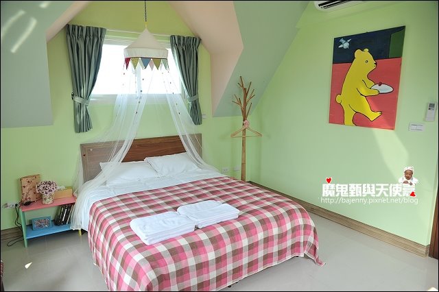 三樓另一間雙人房,有女孩兒最愛的浪漫公主帳,妹妹原本囑意睡這間,已經拉媽媽要進門躺平,但被我們發現有一隻大蚊子入侵,馬上撤退。最後我們住在三樓的四人房,因為當天只有我們入住該樓層,雖然上廁所要出房門, 但沒什麼不便,反倒是沒有WIFI可使用,比較不方便!因為這裡的WIFI只有到二樓區間...
