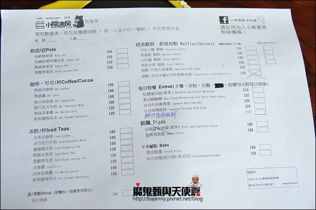彩虹屋點餐單,這裡的廚師是從小熊書房梅花湖總店過來支援,餐點口味還不錯,而且比梅花湖划算,根本就是在搶自家生意...