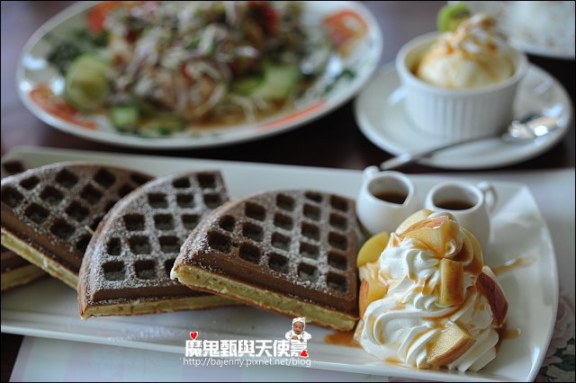 一樓餐廳的用餐空間有好幾個區塊,有點半戶外的玻璃屋空間,亦設置浪漫窗紗與冷氣,感覺也相當舒服。這裡主要提供簡餐與輕食飲料,從十一點開始營業,一直做到六~七點關門,住宿客人會給鬆餅券跟飲料,可當下午茶吃,但不含早餐,如果挨得住餓,也可以退房後當早午餐享用。